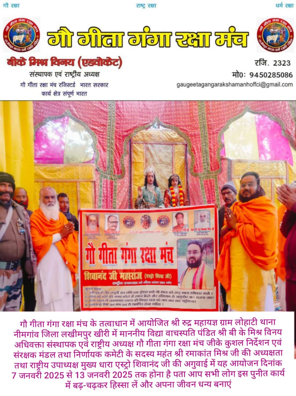 गौ गीता गंगा रक्षा मंच के राष्ट्रीय महामंत्री विधि प्रकोष्ठ अधिवक्ता उच्च न्यायालय लखनऊ श्री सुरेश कुमार मिश्र जी की अगवाई में होगा भव्य आयोजन।
